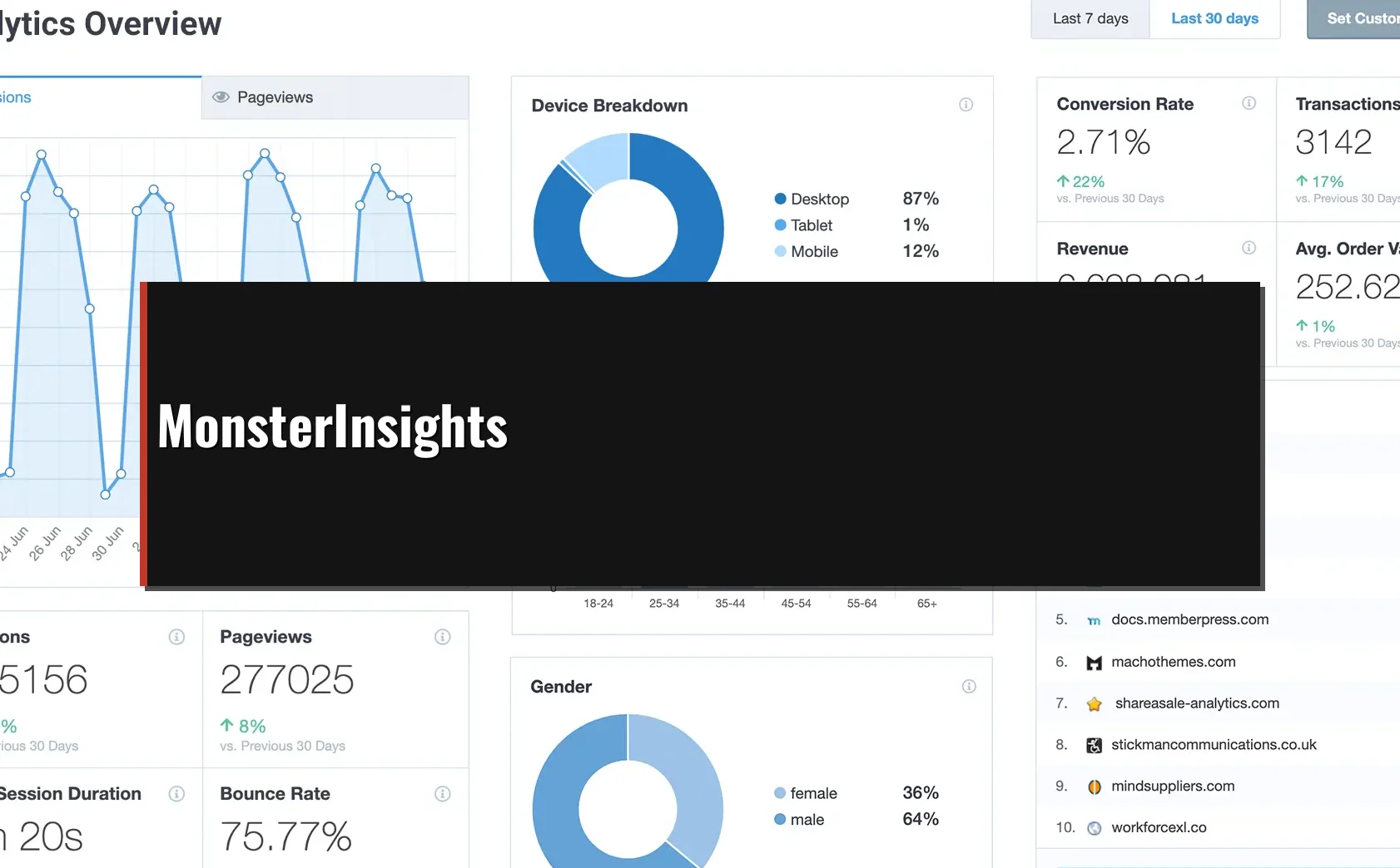 - Informes de análisis detallados: MonsterInsights proporciona informes detallados sobre el tráfico, las páginas más visitadas, la tasa de rebote, el tiempo de sesión promedio y más